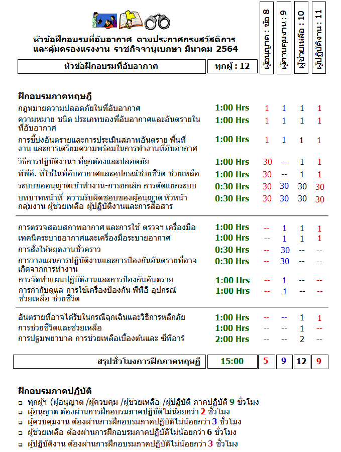 | อ้างอิง : ประกาศกรมสวัสดิการและคุ้มครองแรงงาน เรื่อง-หลักเกณฑ์ วิธีการและหลักสูตรฝึกอบรมความปลอดภัยในการทำงานในที่อับอากาศ : 24 ธันวาคม พุทธศักราช 2563, ประกาศในราชกิจจานุเบกษา วันที่ 11 มีนาคม พุทธศักราช 2564 |