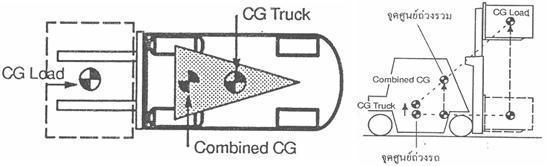| เมื่อรถบรรทุกโหลด จุดศูนย์ถ่วงรวม (Combined CG) จะขยับไปด้านหน้าเข้าใกล้ฐานรับแรงด้านหน้ามากขึ้น แต่จะมีระยะไกลจากฐานรับแรงด้านข้าง หากมีแรงมากระทำตัวอย่างเช่นบรรทุกโหลดและเบรคกระทันหัน รถฯ จะคะมำหน้า, ในแง่ทางเทคนิคควบคุมหรือเทคนิคการใช้โฟร์ค-ลิฟท์ ขนย้ายของจึงกำหนดว่า |